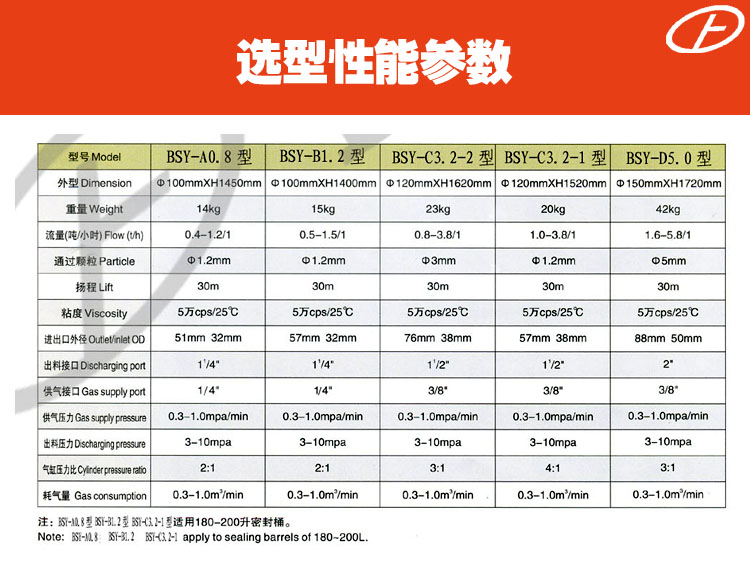 注:BSY-A0.8型、BSY-B1.2型、BSY-C3.2-1型適用180-200L密封桶,即做氣動油桶泵。 泵適用于低中高黏度,干、濕法仿此合成革生產(chǎn)線上的漿料的自動輸送,及油料的輸送。