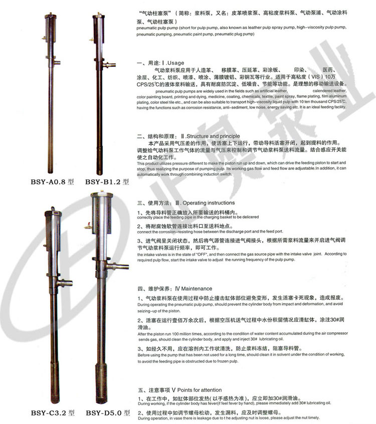 BSY-A0.8型氣動漿料泵(柱塞泵)(簡稱:氣動油桶泵,又稱氣動漿料泵、皮革漿料泵、打料漿料泵、氣動抽液泵、氣動柱塞泵、打料泵浦、氣動泵浦、氣動涂料泵)。氣動漿料泵應(yīng)用于人造革、移膜革、壓延革、彩涂板、印染、醫(yī)藥、涂層、化工、紡織、噴漆、噴涂、薄膜鍍鋁、彩鋼瓦等行業(yè)。適用于高粘度(VIS)≤12萬CPS/25℃的化工漿料輸送,具有防爆耐腐防沉淀、低噪音、等功能。是理想的移動輸送設(shè)備。
